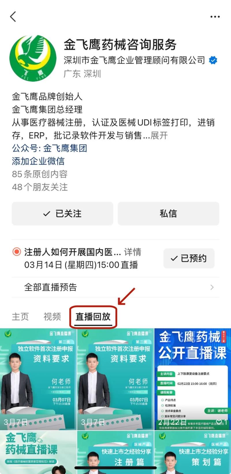 往期直播培訓(xùn)課程支持回放,關(guān)注“金飛鷹藥械咨詢服務(wù)”視頻號并點擊視頻號主頁,即可查看“直播回放”哦~