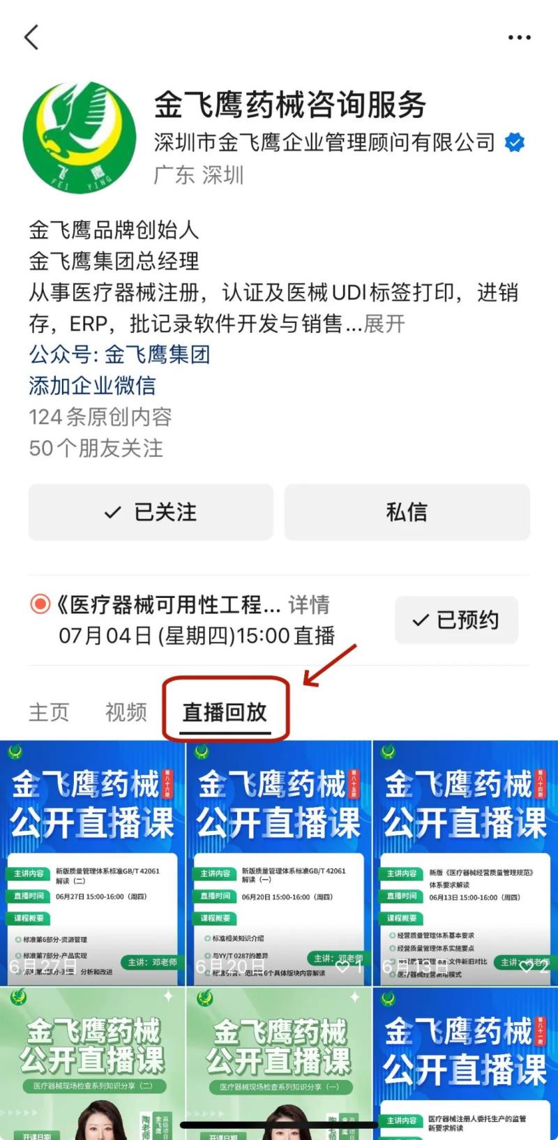 往期直播培訓(xùn)課程支持回放,關(guān)注“金飛鷹藥械咨詢服務(wù)”視頻號(hào)并點(diǎn)擊視頻號(hào)主頁(yè),即可查看“直播回放”哦~