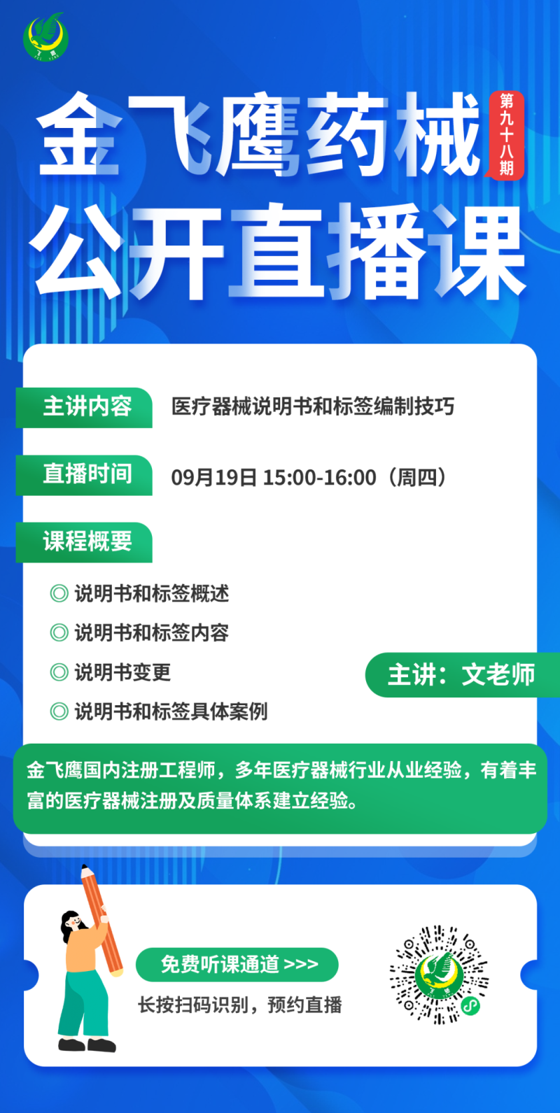 9月19日下午3點,金飛鷹國內(nèi)注冊工程師,有著豐富的醫(yī)療器械注冊及質(zhì)量體系建立經(jīng)驗的文老師,給大家?guī)怼夺t(yī)療器械注冊入門知識分享-產(chǎn)品說明書和標簽編制技巧》,培訓內(nèi)容包括說明書和標簽概述、說明書和標簽內(nèi)容、說明書變更、說明書和標簽具體案例,大家千萬不要錯過了!