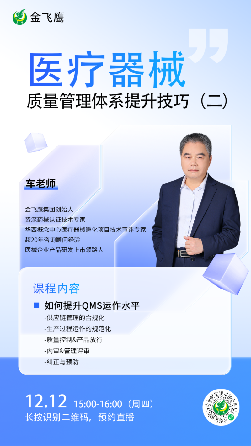 金飛鷹直播培訓(xùn),是每周一次的固定培訓(xùn)欄目,優(yōu)選金飛鷹國內(nèi)外資深注冊(cè)/項(xiàng)目老師定期為大家講解醫(yī)療器械注冊(cè)相關(guān)知識(shí),解答大家在醫(yī)療器械注冊(cè)過程中的諸多疑問。