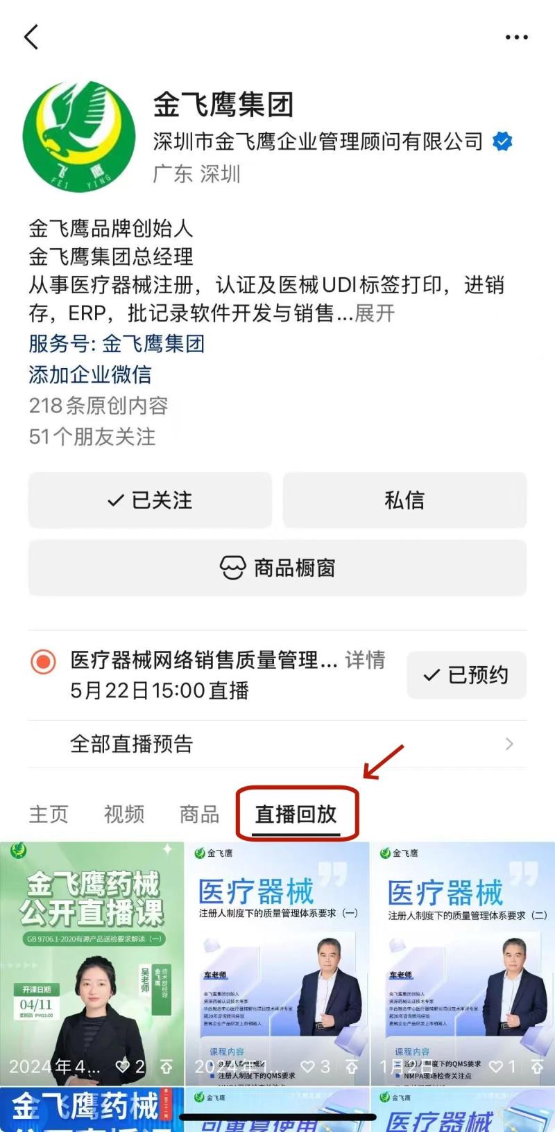 往期直播培訓(xùn)課程支持回放,關(guān)注“金飛鷹藥械咨詢服務(wù)”視頻號并點(diǎn)擊視頻號主頁,即可查看“直播回放”哦~