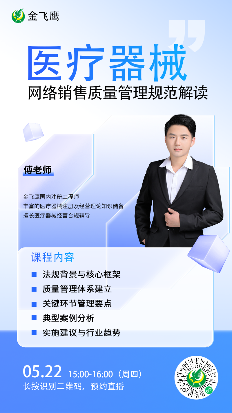 5月22日下午3點(diǎn),金飛鷹國內(nèi)注冊工程師、擅長醫(yī)療器械經(jīng)營合規(guī)輔導(dǎo)的傅老師給大家?guī)怼夺t(yī)療器械網(wǎng)絡(luò)銷售質(zhì)量管理規(guī)范解讀》,他將立足醫(yī)療器械網(wǎng)絡(luò)銷售監(jiān)管新形勢,系統(tǒng)解讀《規(guī)范》的立法背景與核心要求,幫助企業(yè)準(zhǔn)確把握政策要點(diǎn)。同時(shí),傅老師還將重點(diǎn)剖析網(wǎng)絡(luò)銷售企業(yè)如何構(gòu)建符合法規(guī)要求的質(zhì)量管理體系及關(guān)鍵環(huán)節(jié)管理要點(diǎn),并通過典型案例分析,為企業(yè)規(guī)避經(jīng)營風(fēng)險(xiǎn)提供實(shí)用指導(dǎo)。