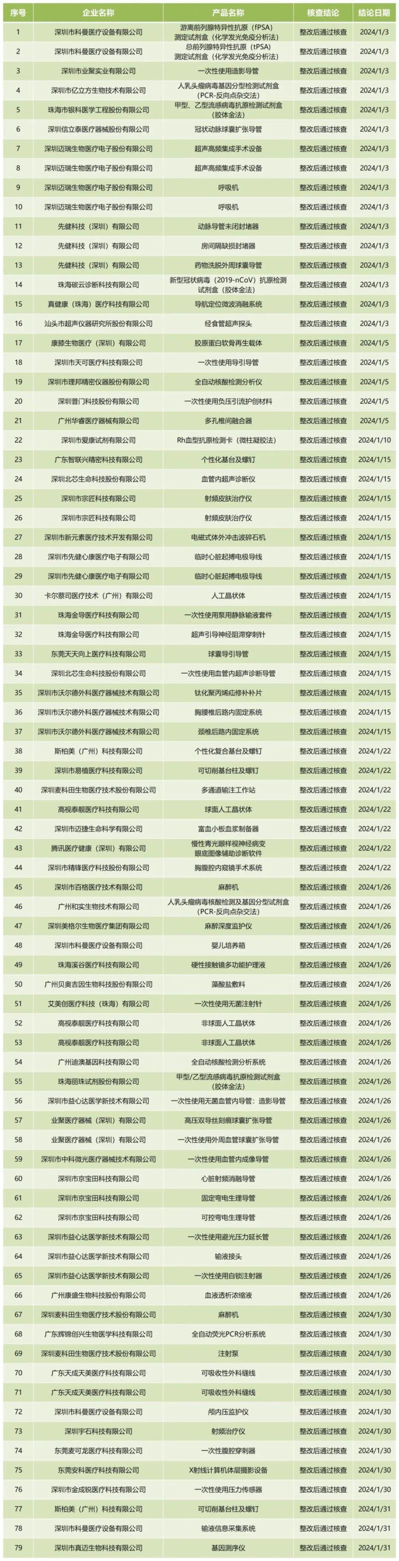 近日,廣東省藥監(jiān)局官網(wǎng)公布2024年1月醫(yī)療器械注冊(cè)質(zhì)量管理體系核查結(jié)果,包括深圳市科曼醫(yī)療設(shè)備有限公司、深圳市宗匠科技有限公司、深圳市中科微光醫(yī)療器械技術(shù)有限公司在內(nèi)的53家企業(yè)共計(jì)79款產(chǎn)品,均為“整改后通過核查”。具體明細(xì)見下方表格: