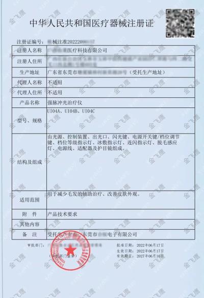 這兩大知名脫毛儀品牌,對應(yīng)的公司名稱分別為由萊和千譽(yù),而你知道他們的產(chǎn)品注冊證(以及生產(chǎn)許可證)是由誰協(xié)助辦理的嗎?沒錯(cuò),就是我們——金飛鷹!(驕傲臉.jpg)