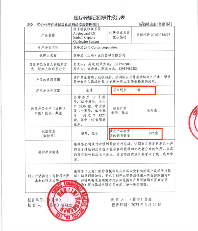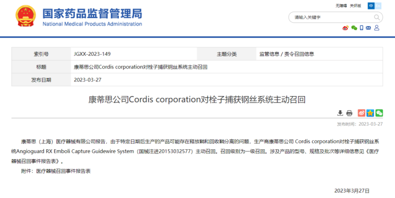 3月27日,國(guó)家藥監(jiān)局官網(wǎng)發(fā)布一則醫(yī)療器械召回公告,由于特定日期后生產(chǎn)的產(chǎn)品可能存在釋放鞘和回收鞘分離的問(wèn)題,生產(chǎn)商康蒂思公司 Cordis corporation對(duì)栓子捕獲鋼絲系統(tǒng)Angioguard RX Emboli Capture Guidewire System(國(guó)械注進(jìn)20153032577)主動(dòng)召回。召回級(jí)別為一級(jí)召回,詳情如下: