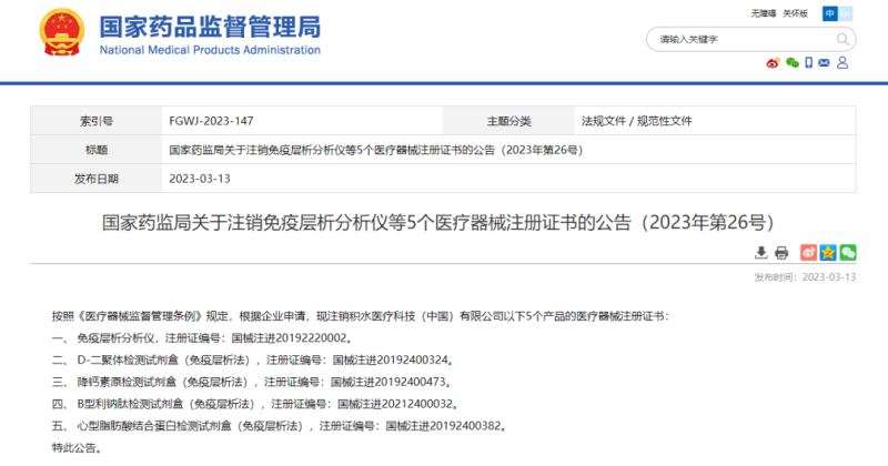 3月13日,國家藥監(jiān)局官網(wǎng)發(fā)布公告稱,按照《醫(yī)療器械監(jiān)督管理?xiàng)l例》規(guī)定,根據(jù)企業(yè)申請(qǐng),注銷積水醫(yī)療科技(中國)有限公司的免疫層析分析儀等5個(gè)產(chǎn)品的醫(yī)療器械注冊(cè)證,具體如下: