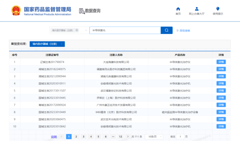 半導(dǎo)體激光器又稱激光二極管,是用半導(dǎo)體材料作為工作物質(zhì)的激光器。常用工作物質(zhì)有砷化鎵、硫化鎘等,激勵方式有電注入、電子束激勵和光泵浦三種方式。我們在國家藥監(jiān)局境內(nèi)醫(yī)療器械注冊數(shù)據(jù)庫中以“半導(dǎo)體激光”進(jìn)行檢索,總計檢索出100多條產(chǎn)品列表,這些產(chǎn)品根據(jù)其波長的不同,有著有脫毛、生發(fā)以及高脂血癥輔助治療等多種預(yù)期用途。