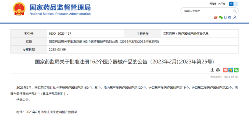 據(jù)國家藥監(jiān)局官網(wǎng)最新公告,2023年2月,國家藥監(jiān)局共批準注冊醫(yī)療器械產(chǎn)品162個。其中,境內(nèi)第三類醫(yī)療器械產(chǎn)品120個,進口第三類醫(yī)療器械產(chǎn)品19個,進口第二類醫(yī)療器械產(chǎn)品22個,港澳臺醫(yī)療器械產(chǎn)品1個(具體產(chǎn)品見附件)。