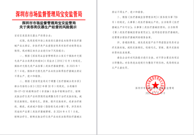 近日,深圳市市場監(jiān)督管理局寶安監(jiān)管局發(fā)布一份關(guān)于美容類儀器生產(chǎn)經(jīng)營風(fēng)險提示的紅頭文件,具體內(nèi)容如下: