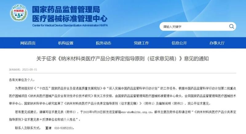 近日,國家藥監(jiān)局醫(yī)療器械標準管理中心官網(wǎng)發(fā)布《納米材料醫(yī)療產(chǎn)品分類界定指導原則(征求意見稿)》,具體內(nèi)容如下: