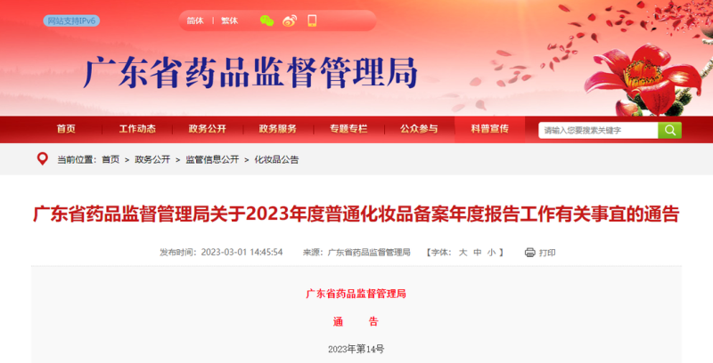 3月1日,廣東省藥監(jiān)局官網(wǎng)發(fā)布《關于2023年度普通化妝品備案年度報告工作有關事宜的通告》,其中指出,自2022年1月1日起,普通化妝品備案人應當于每年1月1日至3月31日期間,通過新注冊備案平臺,提交備案時間滿一年普通化妝品的年度報告。2023年度備案年度報告工作已于2023年1月1日開始,將于2023年3月31日結束。2021年12月31日前備案的產(chǎn)品應當開展2023年度備案年度報告工作。