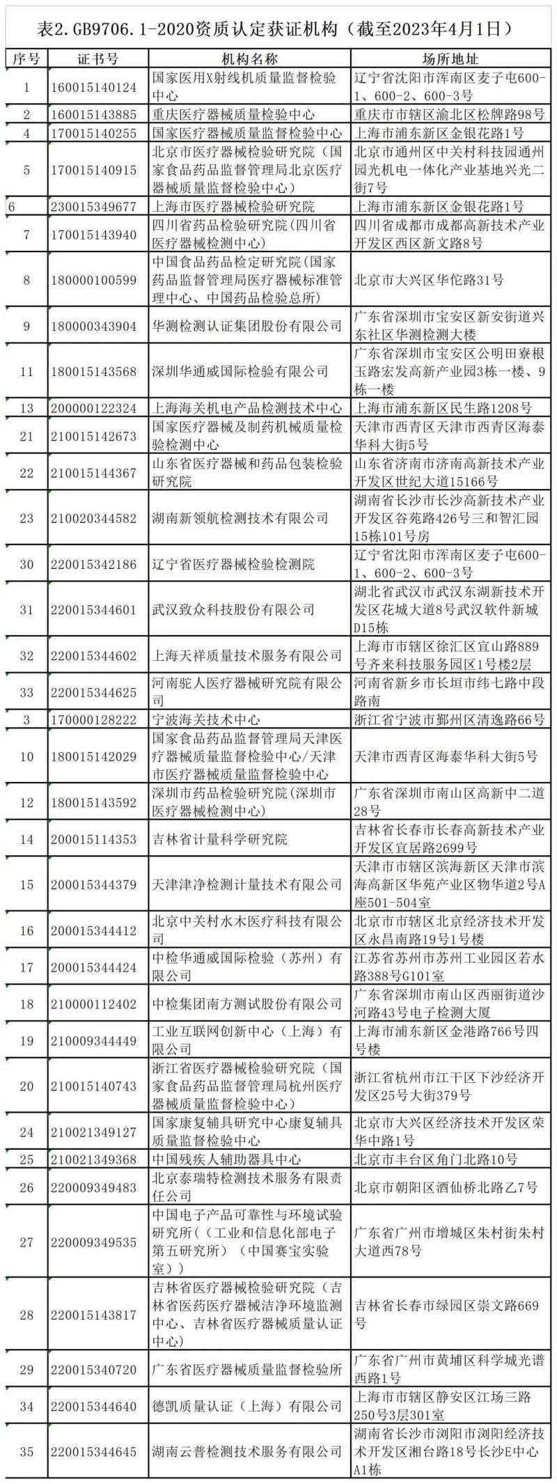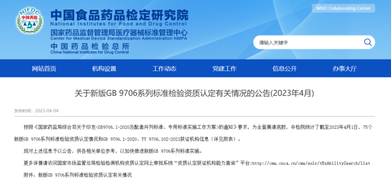 近日,中檢院官網(wǎng)發(fā)布《關(guān)于新版GB 9706系列標(biāo)準(zhǔn)檢驗資質(zhì)認(rèn)定有關(guān)情況的公告(2023年4月)》(以下簡稱《公告》),公布了截至2023年4月1日,75個新版GB 9706系列標(biāo)準(zhǔn)檢驗資質(zhì)認(rèn)定情況和GB 9706.1-2020、YY 9706.102-2021獲證機(jī)構(gòu)信息(詳見文末附件),其中GB 9706.1-2020資質(zhì)認(rèn)定獲證機(jī)構(gòu)具體如下: