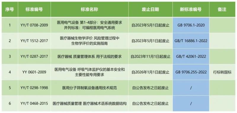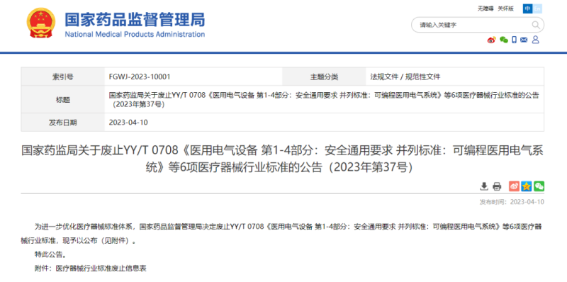 4月10日,國(guó)家藥監(jiān)局官網(wǎng)發(fā)布公告稱(chēng),廢止YY/T 0708-2009《醫(yī)用電氣設(shè)備 第1-4部分:安全通用要求 并列標(biāo)準(zhǔn):可編程醫(yī)用電氣系統(tǒng)》、YY/T 0287-2017《醫(yī)療器械 質(zhì)量管理體系 用于法規(guī)的要求》等6項(xiàng)行業(yè)標(biāo)準(zhǔn),在國(guó)家藥監(jiān)局發(fā)布的原有附件基礎(chǔ)上,我們加上了這幾項(xiàng)標(biāo)準(zhǔn)的新版替代標(biāo)準(zhǔn),具體如下: