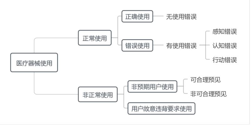 正常使用從使用結(jié)果角度可分為正確使用和錯(cuò)誤使用,其中正確使用是指沒有錯(cuò)誤使用的正常使用,其產(chǎn)生的風(fēng)險(xiǎn)均可接受;錯(cuò)誤使用是指用戶行動(dòng)或行動(dòng)缺失導(dǎo)致異于注冊(cè)申請(qǐng)人或用戶所預(yù)期的醫(yī)療器械響應(yīng),其可能降低醫(yī)療器械的有效性或者產(chǎn)生不可接受的風(fēng)險(xiǎn),導(dǎo)致患者、用戶或相關(guān)人員受到傷害或死亡。