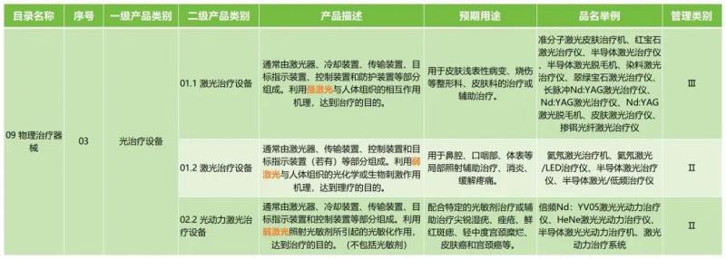 首先,用于醫(yī)美用途的激光產(chǎn)品都屬于《醫(yī)療器械分類目錄》子目錄“09 物理治療器械”,其分類編碼為09-03-01及09-03-02。激光醫(yī)美產(chǎn)品產(chǎn)品描述、預(yù)期用途如下: