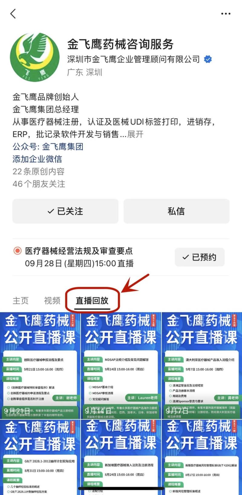往期直播培訓(xùn)課程支持回放,關(guān)注“金飛鷹藥械咨詢服務(wù)”視頻號并點擊視頻號主頁,即可查看“直播回放”哦~