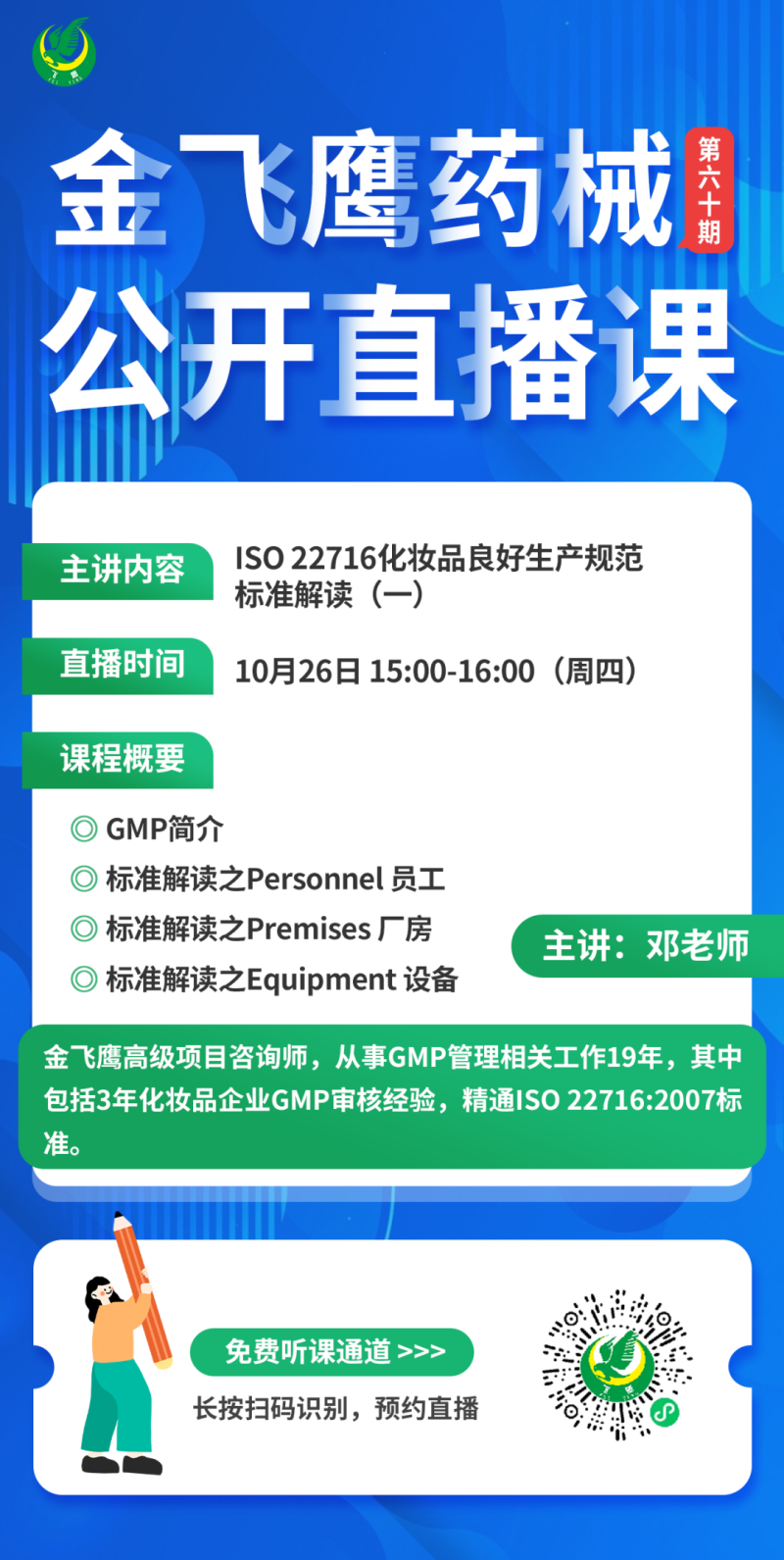 10月26日下午3點(diǎn),金飛鷹高級項(xiàng)目咨詢師,從事GMP管理相關(guān)工作19年,其中包括3年化妝品企業(yè)GMP審核經(jīng)驗(yàn)的鄧?yán)蠋煟?/span>給大家?guī)?/span>《ISO 22716化妝品良好生產(chǎn)規(guī)范標(biāo)準(zhǔn)解讀(一)》,培訓(xùn)內(nèi)容包括GMP簡介、標(biāo)準(zhǔn)解讀(員工、廠房及設(shè)備),大家千萬不要錯過了哦!