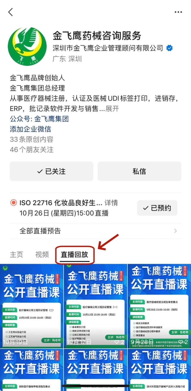 往期直播培訓課程支持回放,關注“金飛鷹藥械咨詢服務”視頻號并點擊視頻號主頁,即可查看“直播回放”哦~