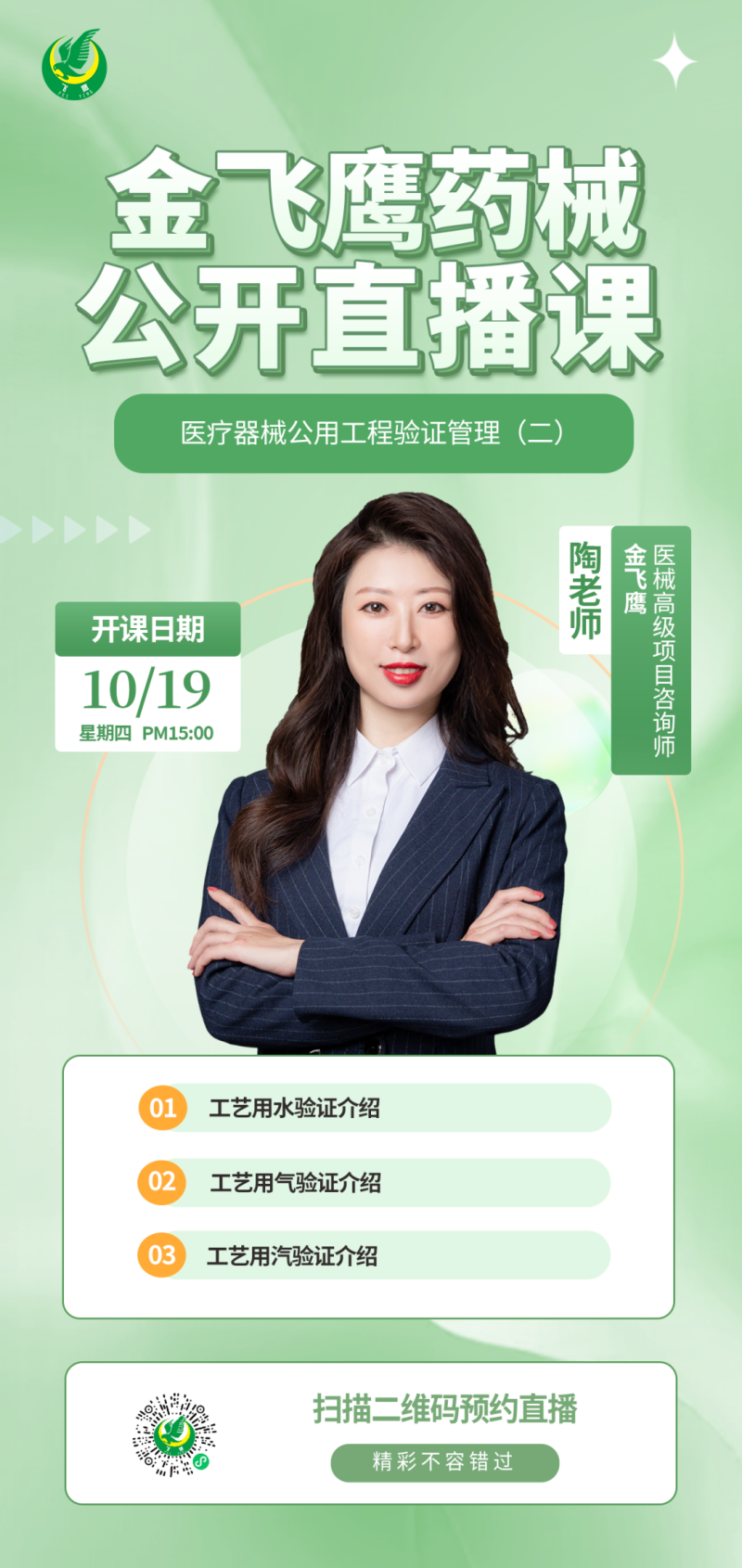 10月19日下午3點,金飛鷹高級項目咨詢師,有著15年工廠管理、7年質量經(jīng)理及廠長經(jīng)驗,曾主導多個Ⅱ類&Ⅲ類醫(yī)療器械廠房項目建設的陶老師,繼續(xù)給大家?guī)?/span>《醫(yī)療器械公用工程驗證管理(二)》,培訓內(nèi)容包括工藝用水驗證介紹、工藝用氣驗證介紹、工藝用汽驗證介紹等,大家千萬不要錯過了哦!