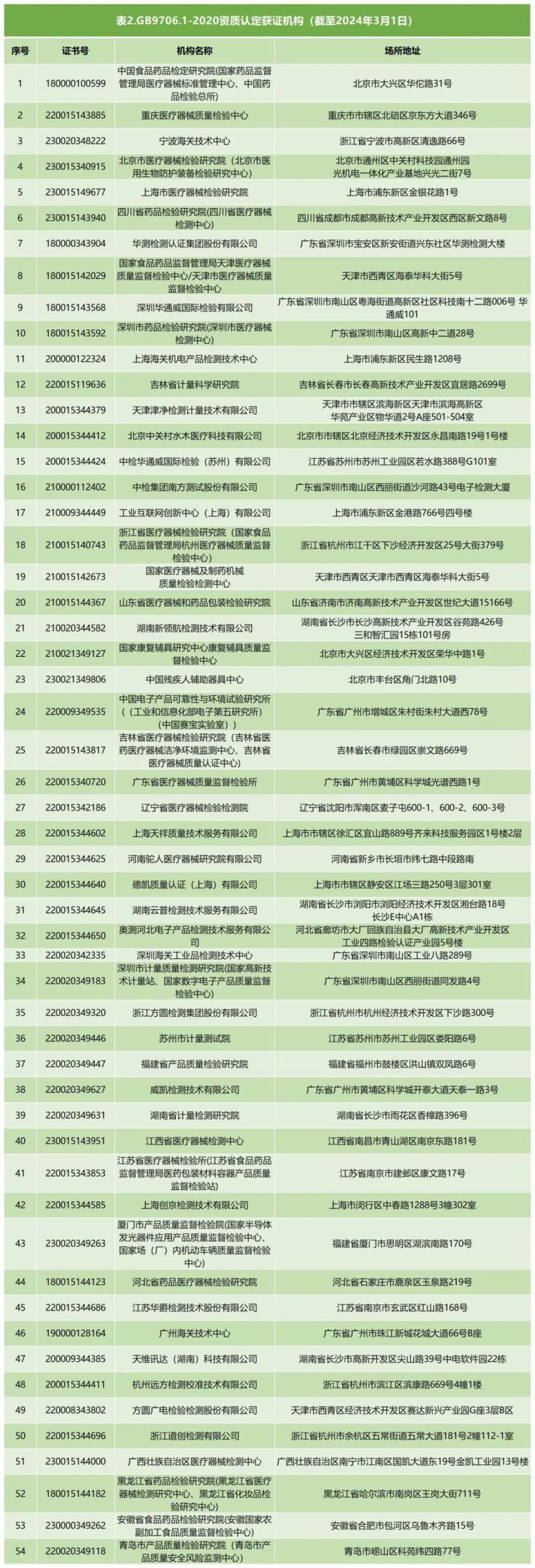 3月4日,中檢院官網(wǎng)公布了截至2024年3月1日,75個(gè)新版GB 9706系列標(biāo)準(zhǔn)檢驗(yàn)資質(zhì)認(rèn)定情況和GB 9706.1-2020、YY 9706.102-2021獲證機(jī)構(gòu)信息。我們從附件表格中可以看到,全國(guó)共有108家GB 9706.1-2020資質(zhì)認(rèn)定獲證機(jī)構(gòu),也就是說(shuō),可以承擔(dān)新標(biāo)的安規(guī)檢測(cè)工作,具體如下: