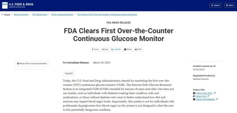 近日,F(xiàn)DA批準(zhǔn)銷售首款非處方(OTC)連續(xù)血糖監(jiān)測儀(CGM)。這款Stelo Glucose Biosensor System,是一種集成的CGM (iCGM),適用于18歲及以上不使用胰島素的任何人,例如使用口服藥物治療病情的糖尿病患者,或希望更好地了解飲食和運(yùn)動如何影響血糖水平的非糖尿病患者。值得注意的是,這個系統(tǒng)不適用于有嚴(yán)重低血糖問題的個體,因?yàn)樵撓到y(tǒng)并未設(shè)計(jì)來提醒用戶這種潛在的危險(xiǎn)狀況。