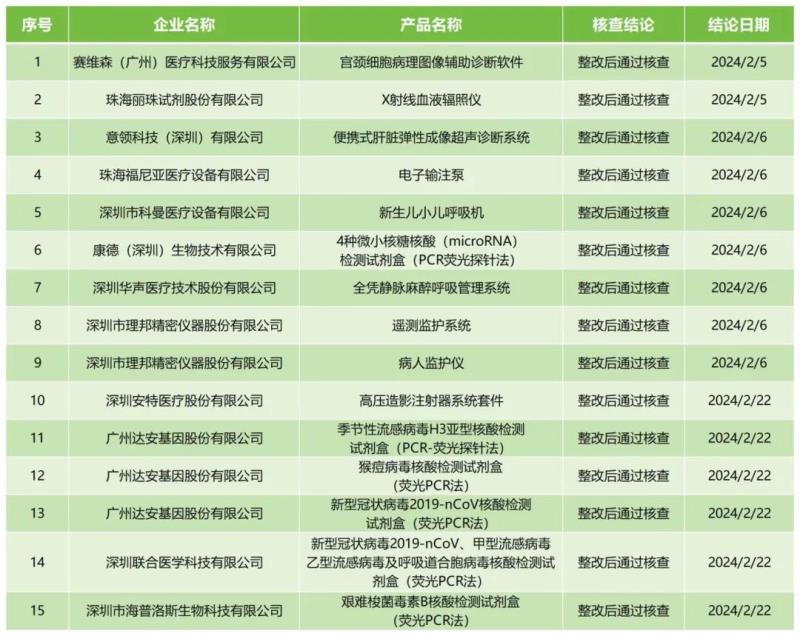 近日,廣東省藥監(jiān)局官網(wǎng)公布2024年2月醫(yī)療器械注冊(cè)質(zhì)量管理體系核查結(jié)果,包括廣州達(dá)安基因股份有限公司、深圳市科曼醫(yī)療設(shè)備有限公司、深圳市理邦精密儀器股份有限公司在內(nèi)的12家企業(yè)共計(jì)15款產(chǎn)品,均為“整改后通過(guò)核查”。具體明細(xì)見(jiàn)下方表格: