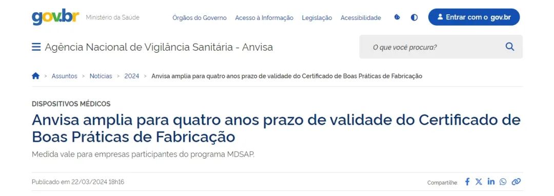 近日,Anvisa發(fā)布RDC 850/2024號(hào)決議,正式將通過MDSAP授予醫(yī)療器械制造商的BGMP證書有效期從兩年延長至四年。條件是制造商在整個(gè)證書有效期內(nèi)都必須繼續(xù)參與MDSAP。