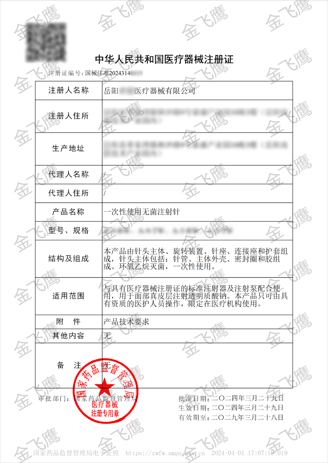 經(jīng)常關(guān)注我們的朋友也許還記得,此前我們跟大家分享過一次皮下電子注射器控制助推裝置(用于配合注射器進(jìn)行定量注射透明質(zhì)酸鈉)的成功案例,而就在近日,水光注射系列產(chǎn)品又有捷報傳來?金飛鷹輔導(dǎo)的湖南一家企業(yè)成功取得【一次性使用無菌注射針】的國內(nèi)Ⅲ類醫(yī)療器械注冊證,值得一提的是,這張Ⅲ類注冊證從受理到發(fā)證只花了不到9個月時間!