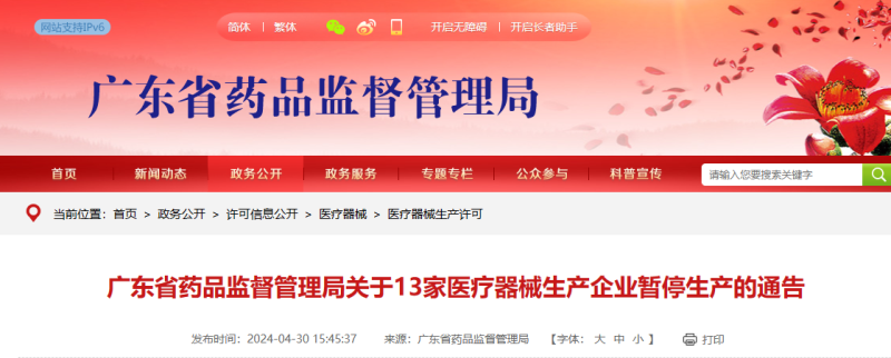 近期,廣東省藥品監(jiān)督管理局組織開展醫(yī)療器械生產企業(yè)監(jiān)督檢查,發(fā)現(xiàn)以下13家企業(yè)質量管理體系存在嚴重缺陷,不符合《醫(yī)療器械生產質量管理規(guī)范》相關規(guī)定,廣東省藥品監(jiān)督管理局已依法采取責令暫停生產的控制措施。