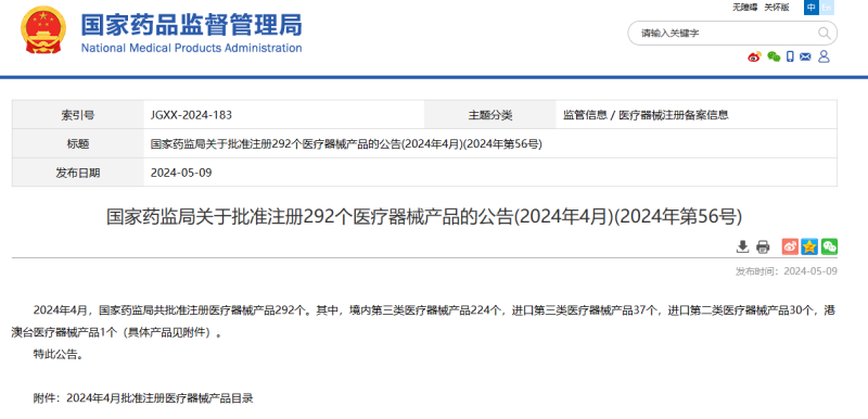 國家藥監(jiān)局發(fā)布,2024年4月共批準(zhǔn)292個(gè)醫(yī)療器械。1月-4月以來國家藥監(jiān)局共批準(zhǔn)注冊(cè)了1131個(gè)醫(yī)療器械產(chǎn)品。