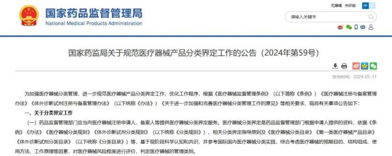 5月11日,國家藥監(jiān)局發(fā)布《關(guān)于規(guī)范醫(yī)療器械產(chǎn)品分類界定工作的公告(2024年第59號)》,具體內(nèi)容如下: