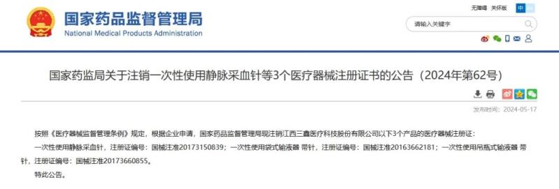 近日,國(guó)家藥監(jiān)局發(fā)布一則醫(yī)療器械注冊(cè)證注銷(xiāo)公告,公告顯示,該局已依法注銷(xiāo)江西三鑫醫(yī)療科技股份有限公司3個(gè)產(chǎn)品的醫(yī)療器械注冊(cè)證,具體如下: