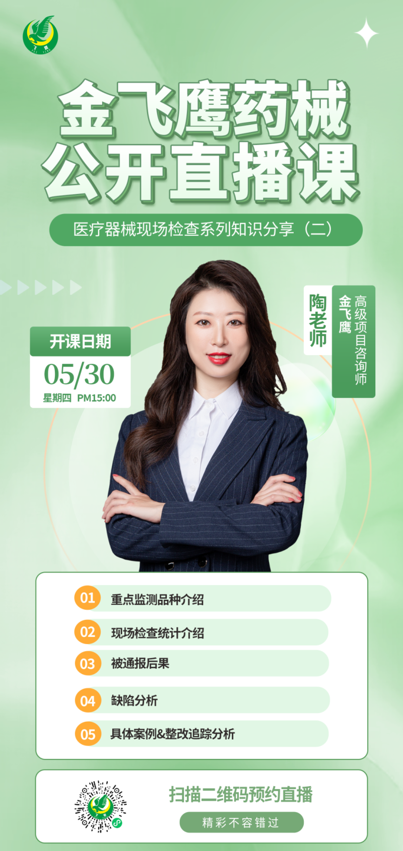 金飛鷹直播培訓(xùn),是每周一次的固定培訓(xùn)欄目,優(yōu)選金飛鷹國內(nèi)外資深注冊/項目老師定期為大家講解醫(yī)療器械注冊相關(guān)知識,解答大家在醫(yī)療器械注冊過程中的諸多疑問。