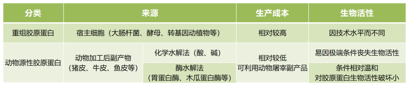 按照來源的不同膠原蛋白可分為重組膠原蛋白和動物源性膠原蛋白。重組膠原蛋白為非天然膠原蛋白,由基因工程技術合成,而動物源性膠原蛋白則從動物組織中提取。動物源性膠原蛋白生產成本較低且生產工藝相對簡單。而重組膠原蛋白擁有更高的生物活性與生物相容性、更低的免疫原性、更低的漏檢病原體隱患風險、更好的水溶性、無細胞毒性以及可進一步加工優(yōu)化等特點,因此其應用范圍更加廣泛,受到市場的強烈關注。