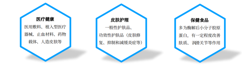 膠原蛋白因為在工業(yè)上有廣泛的應用,被認為是用途最廣泛的生物材料之一。由于其高蛋白質含量以及諸如吸水性、凝膠形成性和乳化穩(wěn)定性的功能性屬性,在食品工業(yè)中對膠原蛋白有著巨大的需求。在生物醫(yī)學和制藥領域,膠原蛋白有著多種應用,被用作藥物、蛋白質和基因的載體,同時也可作為人造人類皮膚、血管和韌帶的替代品。