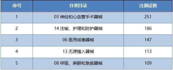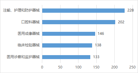 ↑ 圖 4 首次注冊第二類有/無源醫(yī)療器械審批數(shù)量前五位