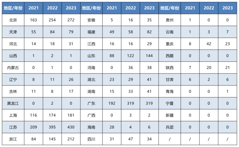 ↑ 表 8 2021-2023年度新增第三類醫(yī)療器械注冊數(shù)量各省分布情況(單位:件)