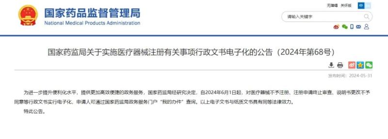 近日,國家藥監(jiān)局發(fā)布公告稱,自2024年6月1日起,對醫(yī)療器械不予注冊、注冊申請終止審查、說明書更改不予同意等行政文書實行電子化,申請人可通過國家藥監(jiān)局政務(wù)服務(wù)門戶“我的辦件”查詢。以上電子文書與紙質(zhì)文書具有同等法律效力。
