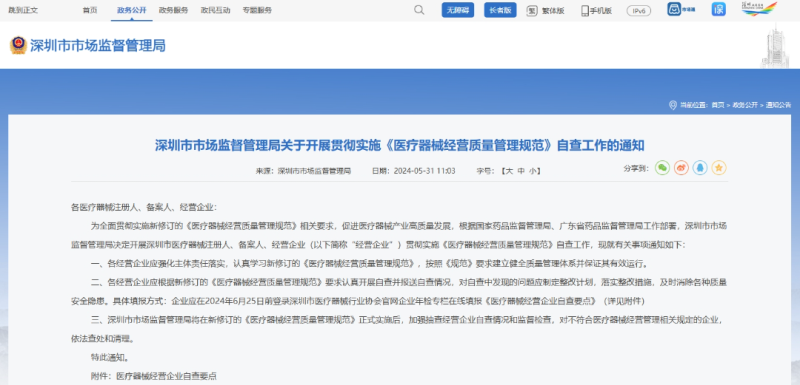 一、各經(jīng)營企業(yè)應(yīng)強(qiáng)化主體責(zé)任落實(shí),認(rèn)真學(xué)習(xí)新修訂的《規(guī)范》,按照《規(guī)范》要求建立健全質(zhì)量管理體系并保證其有效運(yùn)行。 二、各經(jīng)營企業(yè)應(yīng)根據(jù)新修訂的《規(guī)范》要求認(rèn)真開展自查并報(bào)送自查情況,對自查中發(fā)現(xiàn)的問題應(yīng)制定整改計(jì)劃,落實(shí)整改措施,及時(shí)消除各種質(zhì)量安全隱患。具體填報(bào)方式:企業(yè)應(yīng)在2024年6月25日前登錄深圳市醫(yī)療器械行業(yè)協(xié)會(huì)官網(wǎng)企業(yè)年檢專欄在線填報(bào)《醫(yī)療器械經(jīng)營企業(yè)自查要點(diǎn)》(詳見附件)。 三、深圳市市場監(jiān)督管理局將在新修訂的《規(guī)范》正式實(shí)施后,加強(qiáng)抽查經(jīng)營企業(yè)自查情況和監(jiān)督檢查,對不符合醫(yī)療器械經(jīng)營管理相關(guān)規(guī)定的企業(yè),依法查處和清理。