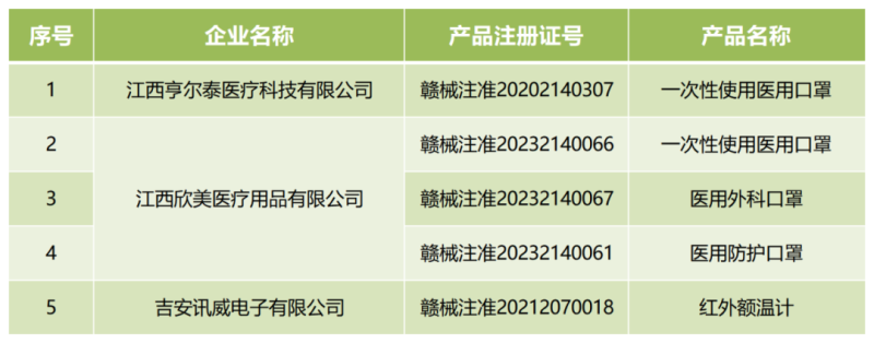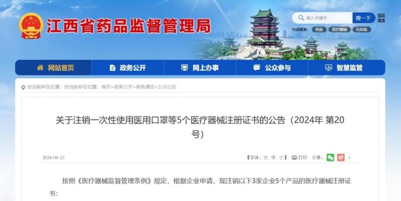 6月13日,江西省藥監(jiān)局發(fā)布一則注銷公告,其中提到,按照《醫(yī)療器械監(jiān)督管理?xiàng)l例》規(guī)定,根據(jù)企業(yè)申請(qǐng),注銷江西欣美醫(yī)療用品有限公司等3家企業(yè)5個(gè)產(chǎn)品(主要為醫(yī)用口罩及紅外額溫計(jì))的醫(yī)療器械注冊(cè)證書,具體明細(xì)如下: