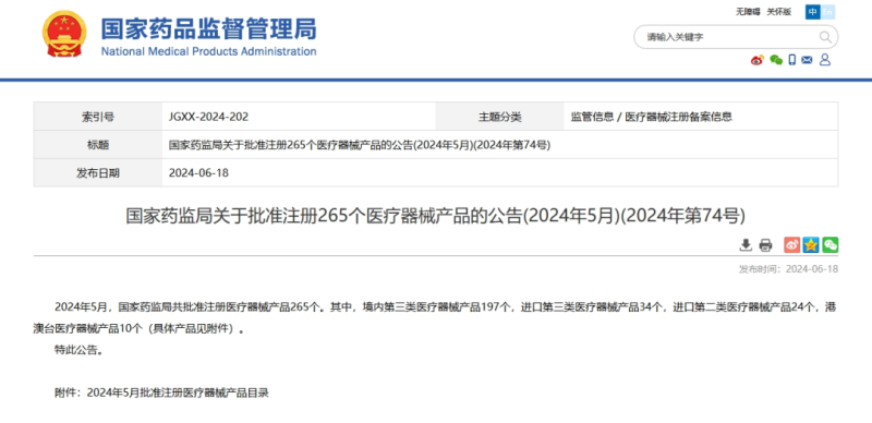 6月18日,國家藥監(jiān)局官網(wǎng)發(fā)布公告稱,2024年5月,國家藥監(jiān)局共批準注冊醫(yī)療器械產(chǎn)品265個。其中,境內第三類醫(yī)療器械產(chǎn)品197個,進口第三類醫(yī)療器械產(chǎn)品34個,進口第二類醫(yī)療器械產(chǎn)品24個,港澳臺醫(yī)療器械產(chǎn)品10個。