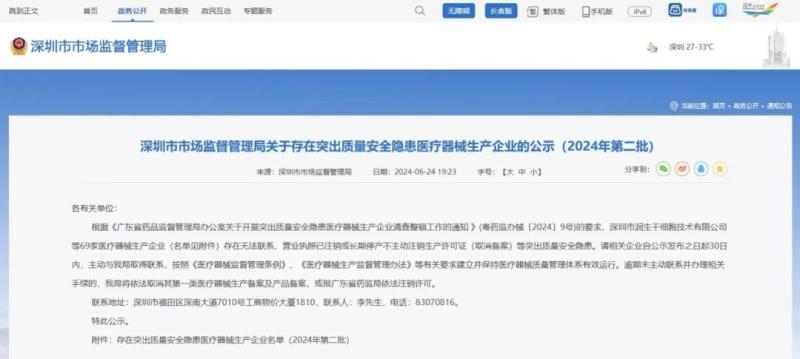 近日,深圳市市場(chǎng)監(jiān)督管理局發(fā)布《關(guān)于存在突出質(zhì)量安全隱患醫(yī)療器械生產(chǎn)企業(yè)的公示(2024年第二批)》,其中指出,深圳市潤(rùn)生干細(xì)胞技術(shù)有限公司、深圳醫(yī)龍科技有限公司等69家醫(yī)療器械生產(chǎn)企業(yè)存在無(wú)法聯(lián)系、營(yíng)業(yè)執(zhí)照已注銷或長(zhǎng)期停產(chǎn)不主動(dòng)注銷生產(chǎn)許可證(取消備案)等突出質(zhì)量安全隱患。