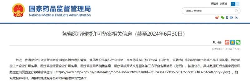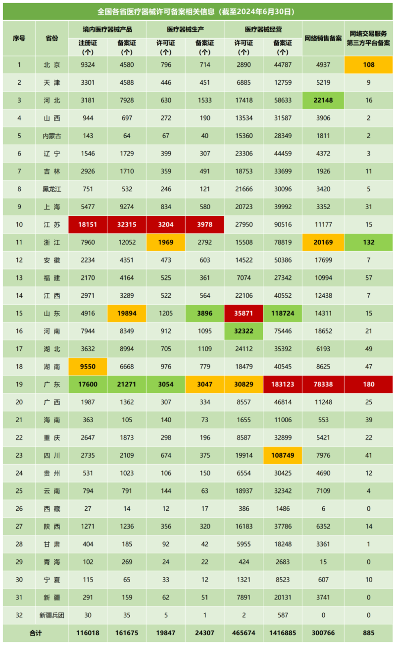7月8日,國家藥監(jiān)局公布了截至2024年6月30日各省有效期內(nèi)醫(yī)療器械產(chǎn)品注冊備案、醫(yī)療器械生產(chǎn)企業(yè)許可備案等信息,老規(guī)矩,金飛鷹小編對此稍作編輯,標注紅色、綠色、黃色的分別為前三甲。