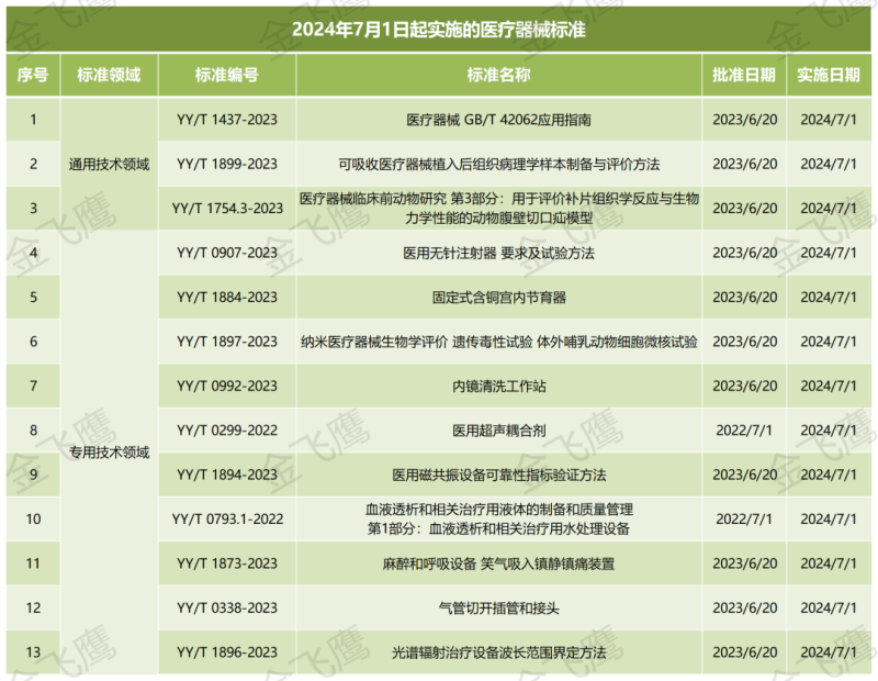 自2024年7月1日起正式實施的共有13項醫(yī)療器械標(biāo)準(zhǔn),其中最值得大家關(guān)注的是YY/T 1437-2023《醫(yī)療器械 GB/T 42062應(yīng)用指南》,除此之外YY/T 0907-2023《醫(yī)用無針注射器 要求及試驗方法》、YY/T 1896-2023《光譜輻射治療設(shè)備波長范圍界定方法》等,具體明細如下: