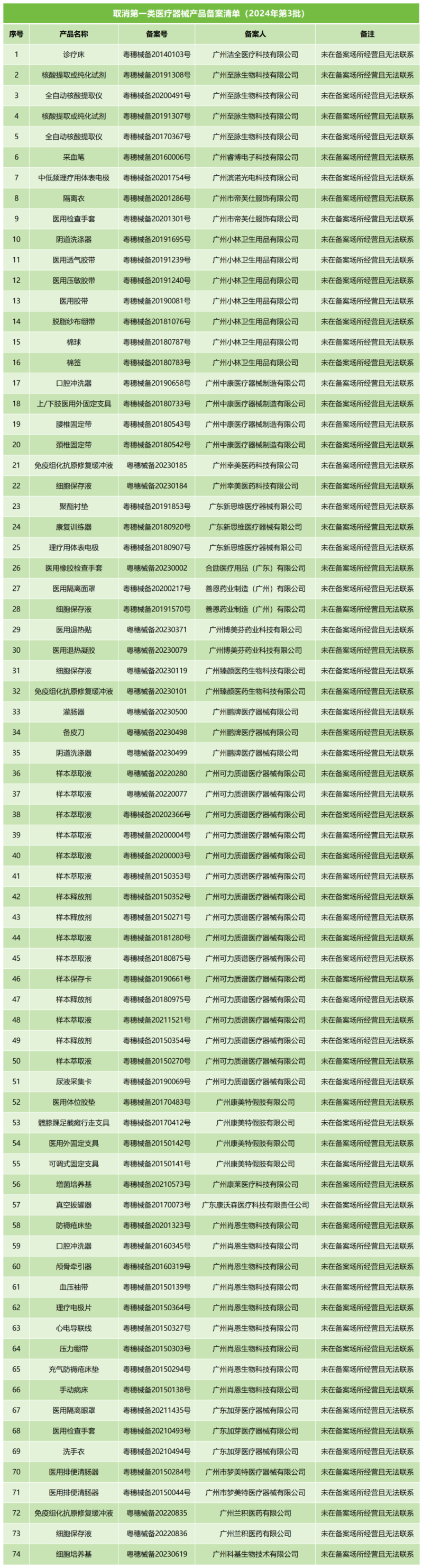 近日,廣州市市場(chǎng)監(jiān)督管理局官網(wǎng)發(fā)布一則取消第一類(lèi)醫(yī)療器械生產(chǎn)備案及產(chǎn)品備案的通告,通告指出,因廣州至脈生物科技有限公司、廣州小林衛(wèi)生用品有限公司、廣州中康醫(yī)療器械制造有限公司等第一類(lèi)醫(yī)械產(chǎn)品備案人未在備案場(chǎng)所經(jīng)營(yíng)且無(wú)法聯(lián)系,該局在公示期結(jié)束后決定取消這些企業(yè)名下的74個(gè)第一類(lèi)醫(yī)療器械產(chǎn)品備案,具體明細(xì)如下:
