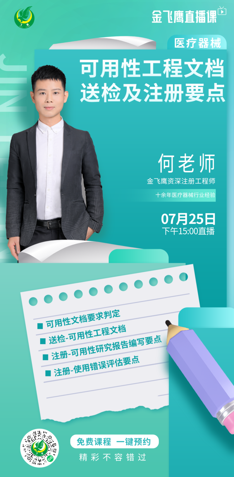 7月25日下午3點(diǎn),金飛鷹資深注冊(cè)工程師,擁有十余年醫(yī)療器械行業(yè)經(jīng)驗(yàn),對(duì)可用性工程頗有研究的何老師,繼續(xù)給大家?guī)?lái)《醫(yī)療器械可用性工程文檔送檢及注冊(cè)要點(diǎn)》,培訓(xùn)內(nèi)容包括可用性文檔要求判定、送檢環(huán)節(jié)的可用性工程文檔要求、注冊(cè)環(huán)節(jié)的可用性研究報(bào)告編寫(xiě)要點(diǎn)及使用錯(cuò)誤評(píng)估要點(diǎn),大家千萬(wàn)不要錯(cuò)過(guò)了哦!