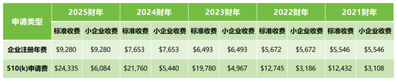 接下來,我們將近幾年來的企業(yè)注冊年費(fèi)和510(k)申請費(fèi)匯總至下方表格,從表格可以看出,這兩項(xiàng)費(fèi)用每年都有上漲,其中510(k)申請費(fèi)(標(biāo)準(zhǔn)收費(fèi))從2021財(cái)年的$12432到2025財(cái)年的$24335,漲幅接近100%:
