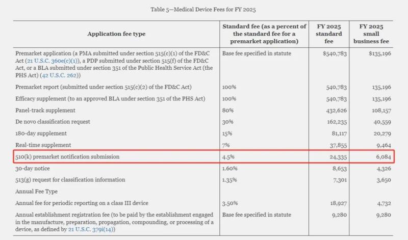 具體來說,企業(yè)注冊年費(fèi)漲至$9280,相比2023財(cái)年的$7653上漲了$1627,漲幅21.2%;510(k)申請費(fèi)(標(biāo)準(zhǔn)收費(fèi))漲至$24335,相比2023財(cái)年的$21760上漲了$2575,漲幅11.8%。當(dāng)然,如果申請了小企業(yè)資質(zhì),企業(yè)的510(k)申請費(fèi)是會便宜很多的,2025財(cái)年是6084美元(2024財(cái)年則是5440美元)。