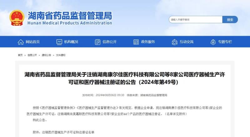8月6日,湖南省藥監(jiān)局發(fā)布公告稱,按照《醫(yī)療器械監(jiān)督管理條例》《醫(yī)療器械生產(chǎn)監(jiān)督管理辦法》有關規(guī)定,根據(jù)企業(yè)申請,現(xiàn)注銷湖南康爾佳醫(yī)療科技有限公司等1家企業(yè)的醫(yī)療器械生產(chǎn)許可證;注銷湖南尚美嘉聯(lián)醫(yī)療科技有限公司等7家企業(yè)的44個產(chǎn)品的醫(yī)療器械注冊證,具體明細如下: