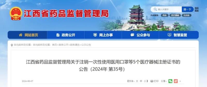 8月7日,江西省藥監(jiān)局發(fā)布公告稱,按照《醫(yī)療器械監(jiān)督管理?xiàng)l例》規(guī)定,根據(jù)企業(yè)申請(qǐng),現(xiàn)注銷江西諾德醫(yī)療器械有限公司等3家企業(yè)的5個(gè)產(chǎn)品(含醫(yī)用口罩、注射泵等)的醫(yī)療器械注冊(cè)證書,具體明細(xì)如下: